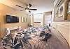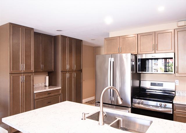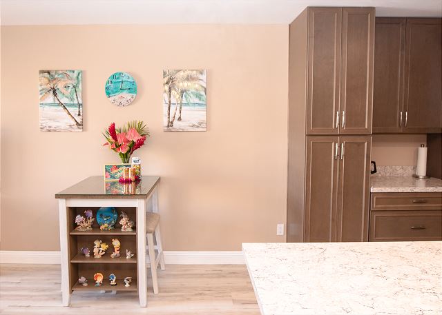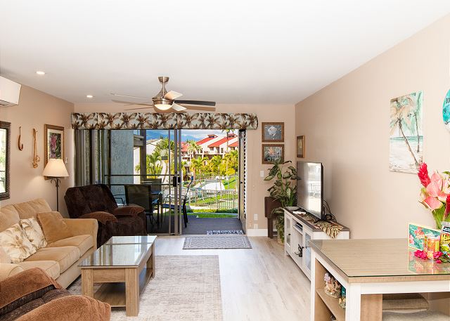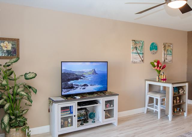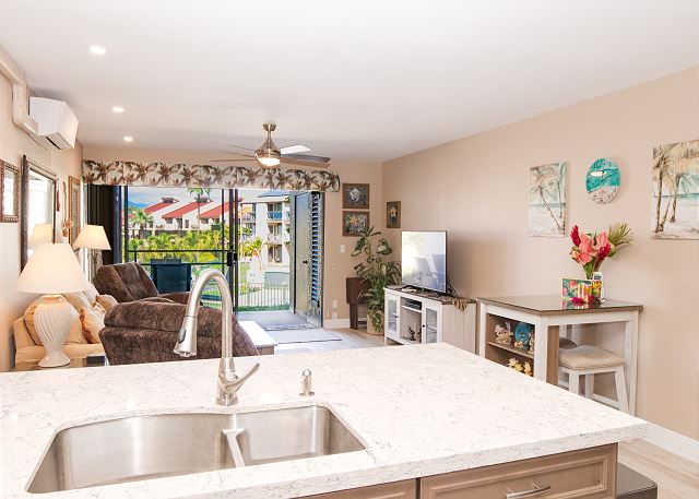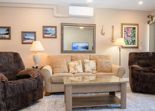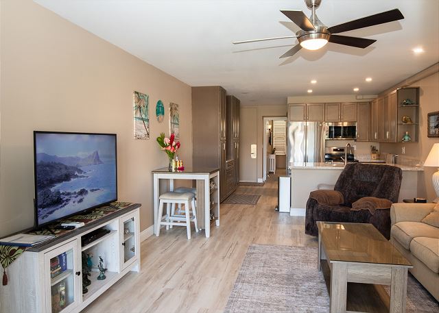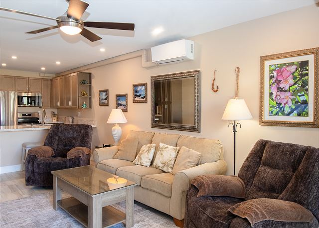 Cozy One Bedroom unit with both Ocean and Garden View, overlooking tennis court, close to pool and BBQ. Well appointed living room, with couch and two lazy boys providing comfortable viewing of the very large flat screen TV - especially after a long day in the sun! Bedroom has king bed, dresser and two nights stands with TV. New windows in the bedroom with slide opening for more fresh air. Walk in shower enclosure. Kitchen and bathroom have granite counter tops and all new cabinets.